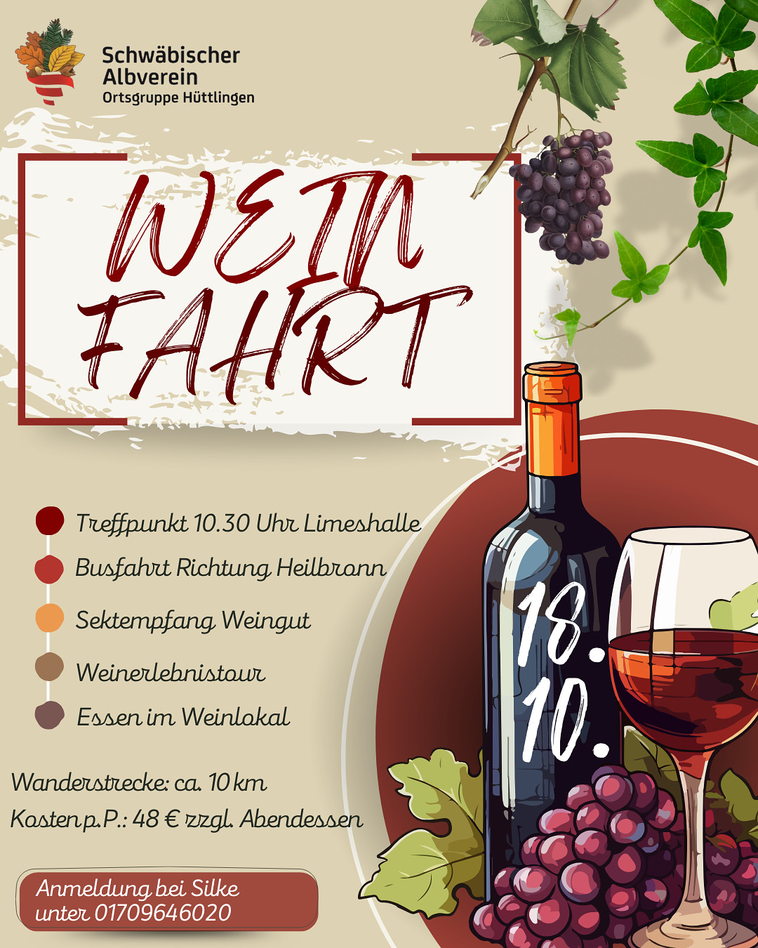 Kosten p.P.: 48€ inkl. Bus, Vesper und Weinverkostung.